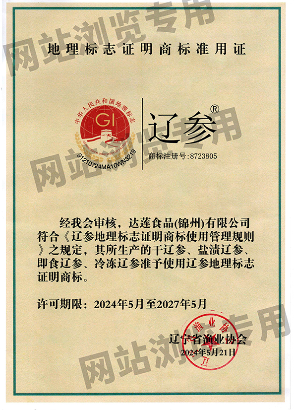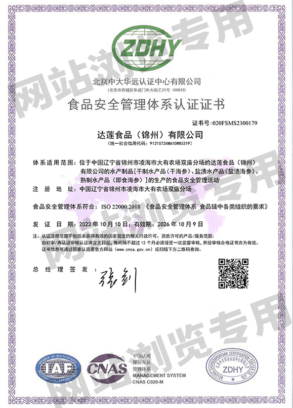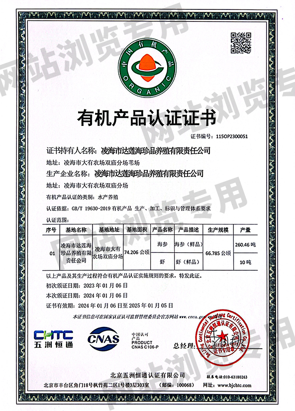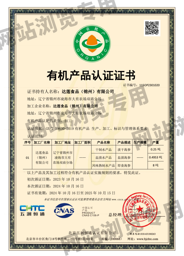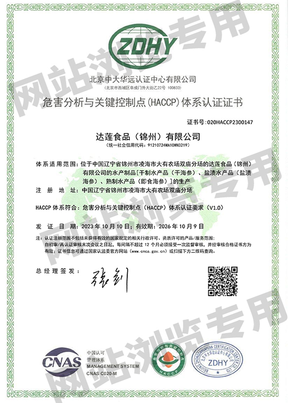 達蓮公司的遼參產品通過養殖、加工雙有機產品認證、遼參認證、ISO9001質量管理體系要求認證ISO22000食品安全管理體系、食品鏈中各類組織的要求認證、HACCP危險分析與關鍵控制點認證等。